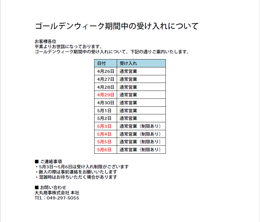 Uncategorized よかったらシェアしてね! URLをコピーしました! 休業日のご案内 関連記事 休業日のご案内 March 23, 2026 新年のご挨拶 January 1, 2026 温水ジェット貸し出し、ハザードランプ点灯のお願い、休日・祝日の受入時間 December 12, 2025 年末年始のお知らせ November 11, 2025